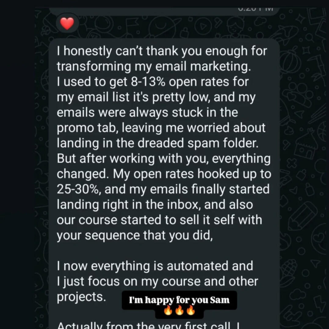 ++(your system, Costs 0$)++You'd finally enjoy your weekends and let the money flow in...I’m confident because I’ve done this before and developed my DFY Email System.Also Sam he owns a business and went from 8% (Open Rates) and was about to hit SPAM folderBut we ran the DFY system and start landing in the primary,obviously made over 50K in sales last month and continuing making more sales.